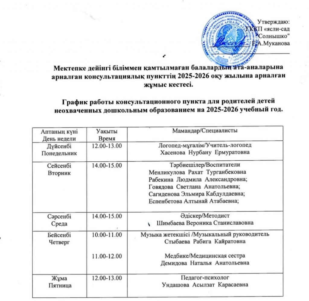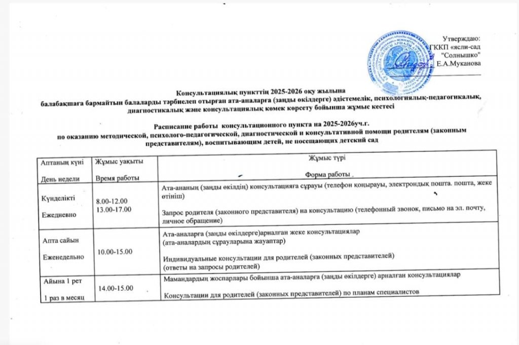 Біздің балабақшада 2 жастан 6 жасқа дейінгі балаларға арналған консультативтік пункт жұмыс істейді.